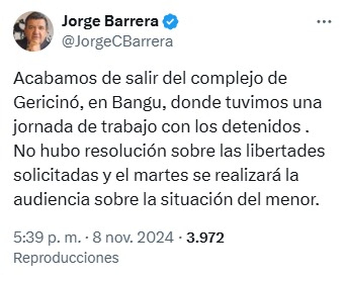 "Acabamos de salir del complejo de Gericinó, en Bangú, donde tuvimos una jornada de trabajo con los detenidos. No hubo resolución sobre las libertades solicitadas y el martes se realizará la audiencia sobre la situación del menor", indicó Barrera en X.