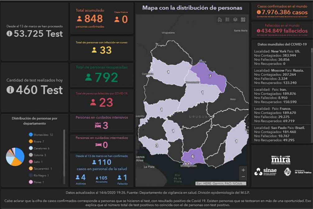 Uruguay no registró ningún caso nuevo de coronavirus en esta jornada de lunes, por lo que la cifra de casos positivos acumulados de coronavirus COVID-19 se mantuvo en 848. De este total, 792 ya se recuperaron y 23 personas fallecieron.