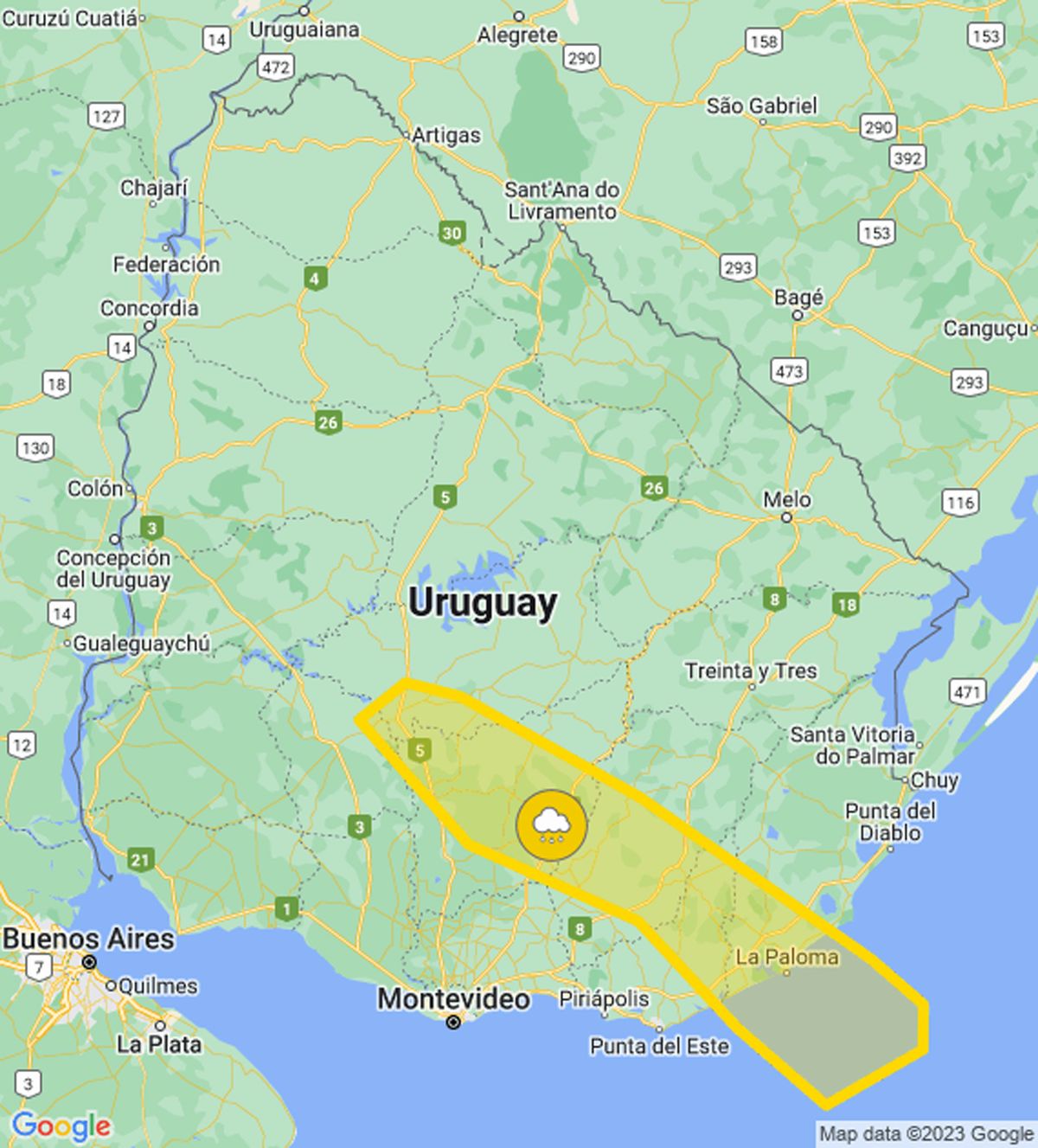 Meteorología publica este jueves de mañana una alerta amarilla por lluvias intensas para una franja que va desde el sur de Durazno hasta el extremo sureste, en Rocha.