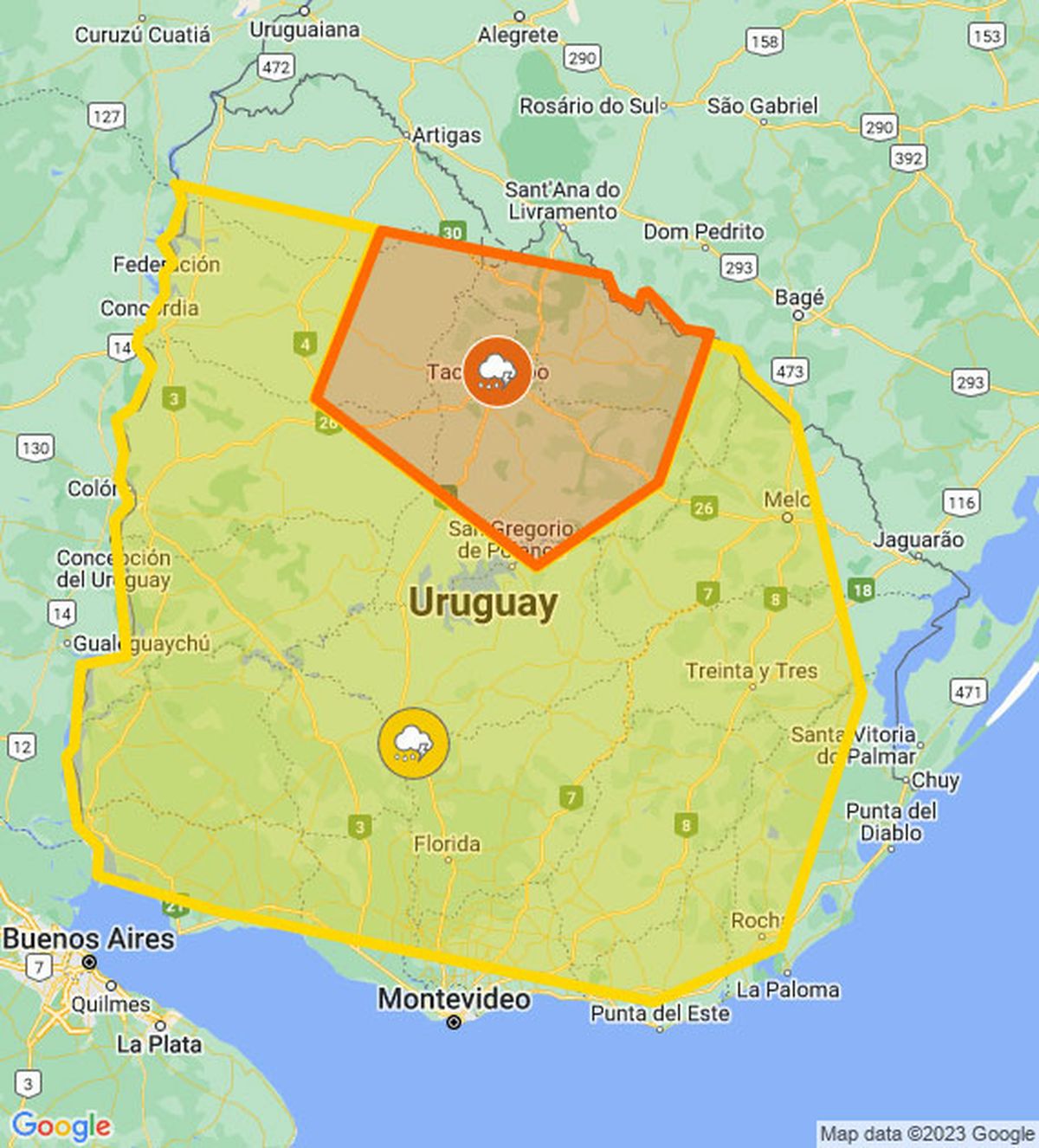 Meteorología actualizó su doble alerta naranja y amarilla por tormentas y lluvias en corto período de tiempo, ocasional granizo, intensa actividad eléctrica y vientos fuertes.