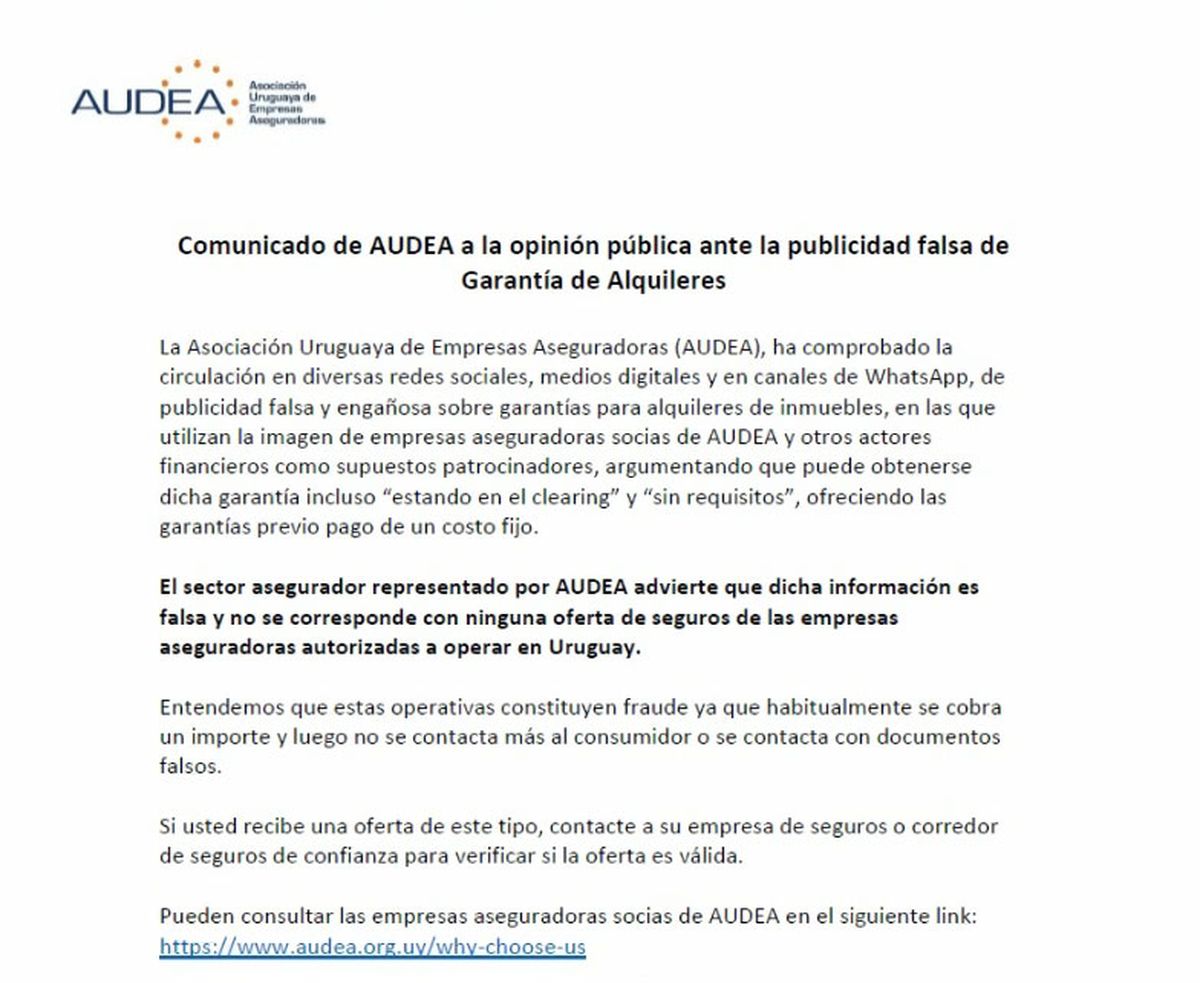 La Asociación de Empresas Aseguradoras advierte por la circulación en diversas redes sociales, medios digitales y canales de WhatsApp, de publicidad falsa y engañosa sobre garantías para alquiler de inmuebles en las que utilizan la imagen de empresas reales y otros actores financieros para realizar una estafa.