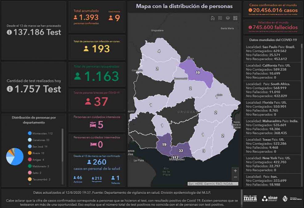 Según el último informe epidemiológico del Sistema Nacional de Emergencias (SINAE) hay 193 personas cursando la enfermedad y cinco de ellas se encuentran internadas en cuidados intensivos. Los departamentos con casos activos son: Artigas, Canelones, Cerro Largo, Flores, Lavalleja, Maldonado, Montevideo, Río Negro, Rivera, Rocha, Salto, San José, Tacuarembó y Treinta y Tres.