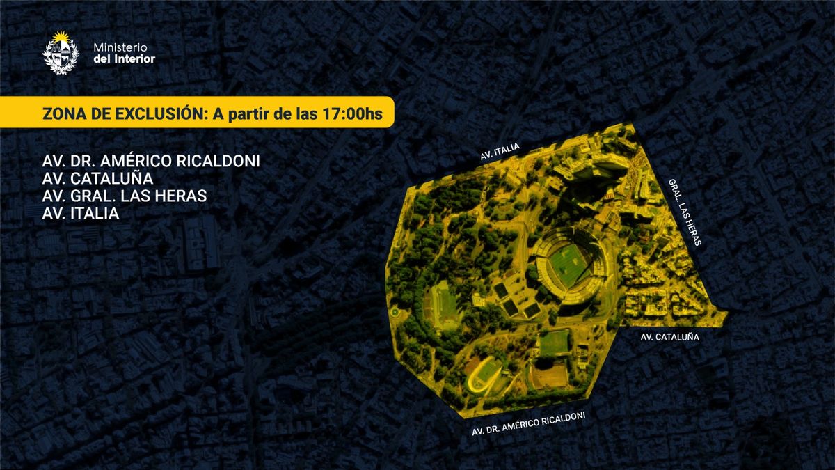 La zona de exclusión comienza a las 17:00 horas entre las calles Américo Ricaldoni, Av. Italia, Gral. Las Heras y Av. Cataluña. El partido es a las 20:30.