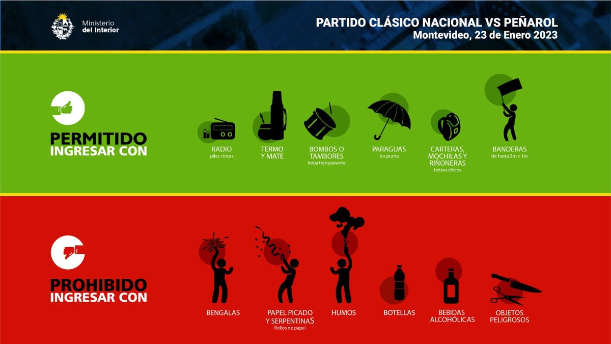 El partido entre Nacional y Peñarol se juega este 23 de enero a las 20:30 en el Estadio Centenario. La zona de exclusión comienza a las 17:00.