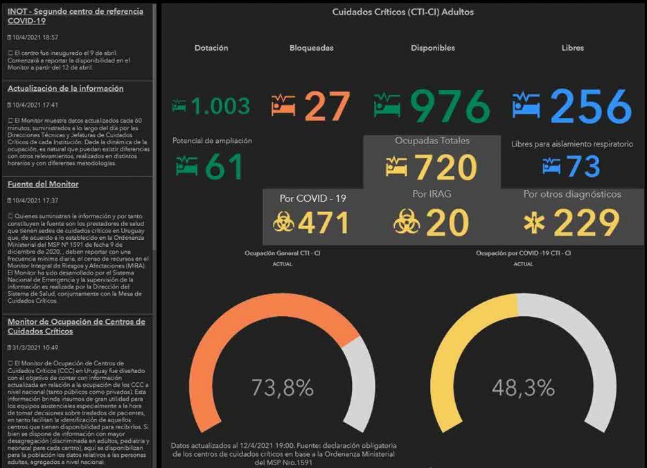 Por su parte, el Ministerio de Salud Pública (MSP) actualizó sus datos del Monitor de Ocupación de Centros de Cuidados Críticos en Uruguay y reportó que hay 976 camas operativas en CTI, de las cuales 720 están ocupadas. De estas últimas 471 corresponden a pacientes con Coronavirus.