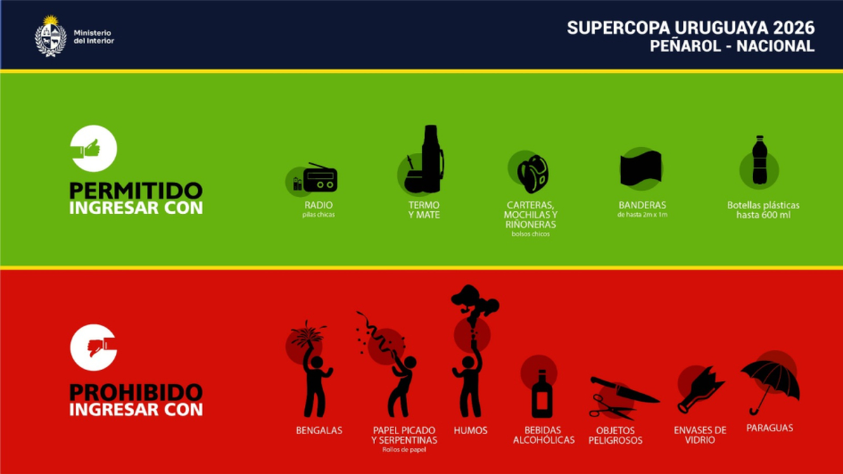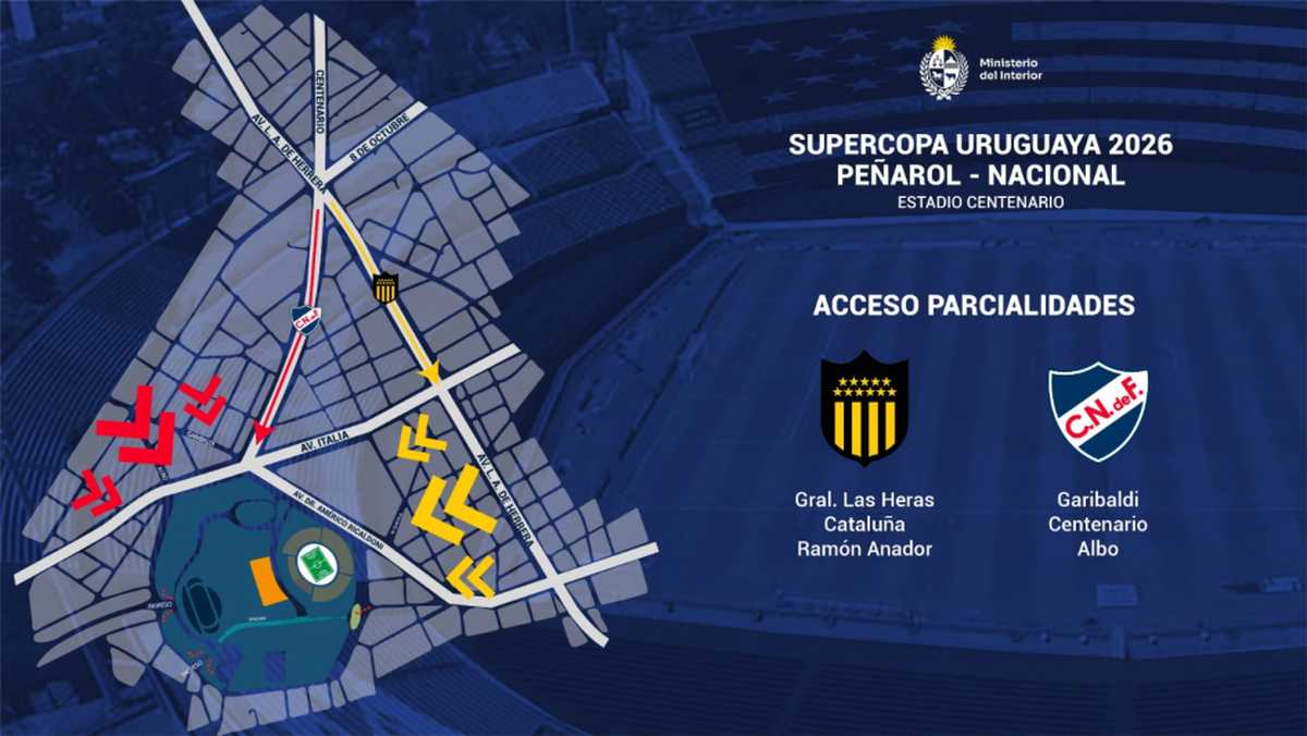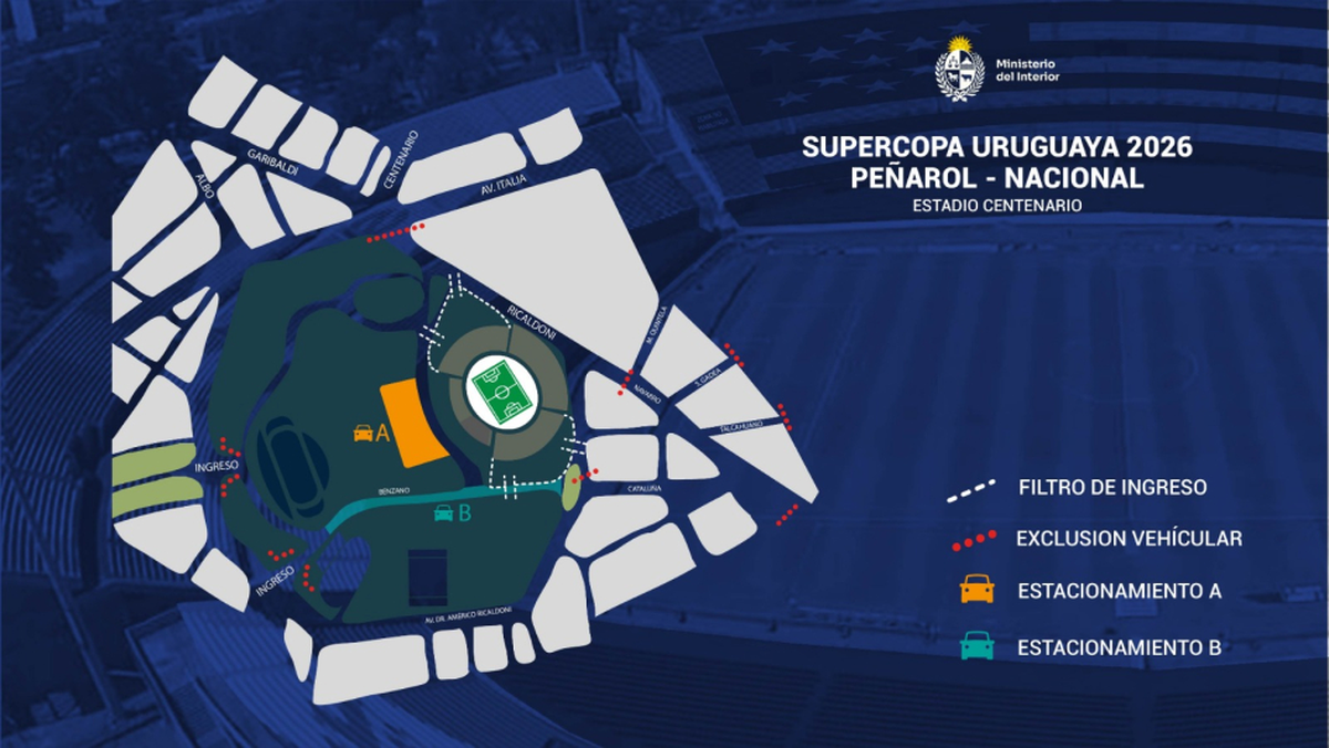 Peñarol y Nacional juegan por la Supercopa Uruguaya 2026 en el Estadio Centenario, a las 20:00 horas. Desde las 14:00 horas de ese día estará el operativo en las zonas aledañas, aunque en general ya se trabaja desde el miércoles, con tareas de patrullaje en el entorno tanto del estadio del Parque Batlle como del Campeón del Siglo y del Gran Parque Central, sedes sociales y las ciudades deportivas de ambos clubes.
