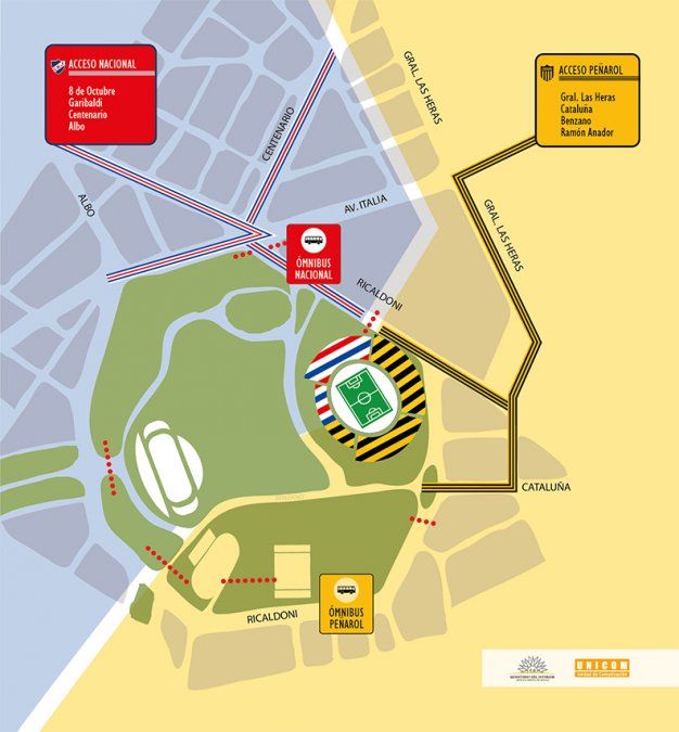 Los hinchas de Nacional llegarán al estadio desde 8 de Octubre, Garibaldi, Centenario y Avenida Italia desde Albo hasta Brito Foresti.