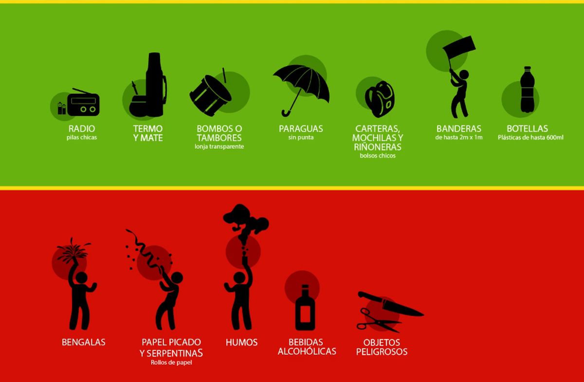 Los objetos permitidos en el estadio, son: radios portátiles con pilas chicas (AA – AAA), paraguas sin punta de ser necesario, bombos, tambores o redoblantes con lonja transparente, banderas de hasta 2 metros por 1 metro con caño de plástico flexible de diámetro no mayor a 1 centímetro, hueco y que no tenga las extremidades tapadas y las banderas tampoco podrán adherirse entre sí para formar una más grande. También se permite termo y mate, botellas plásticas hasta 600 ml. para hidratación, carteras, bandoleras, mochilas, bolsos y riñoneras.