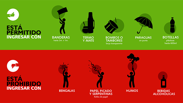 El ingreso de banderas y elementos de percusión, solo se podrá hacer “hasta una hora antes del inicio del partido, pasado ese plazo no se permitirá el ingreso de dichos elementos”, dice la Policía.