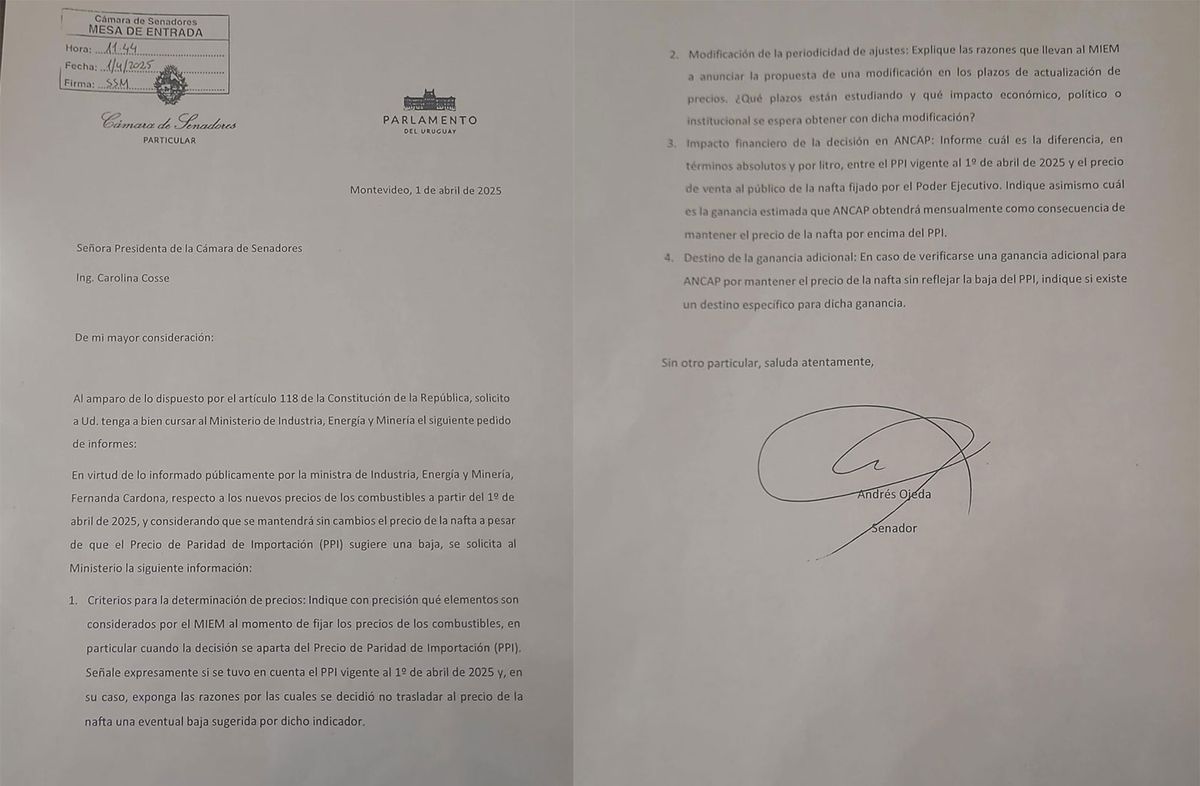 El senador del Partido Colorado Andrés Ojeda envió al Ministerio de Industria un pedido de informes para que explique por qué no bajó el precio de la nafta si el informe oficial de la Unidad Reguladora de Servicios de Energía y Agua (Ursea) indicaba un descenso del precio de paridad de importación (PPI) en marzo.