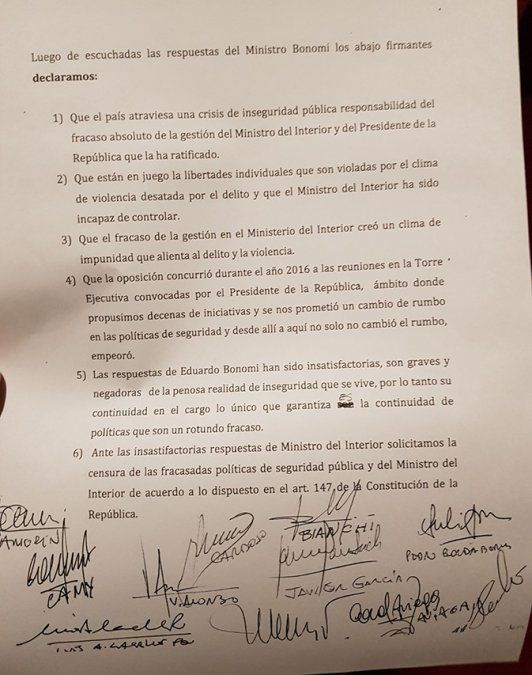 La moción fue presentada por los Partidos Nacional y Colorado durante la interpelación que se realizó este miércoles al ministro Bonomi, convocada por el aumento en la cantidad de homicidios en lo que va del año y por contrataciones presuntamente irregulares en el Ministerio del Interior.