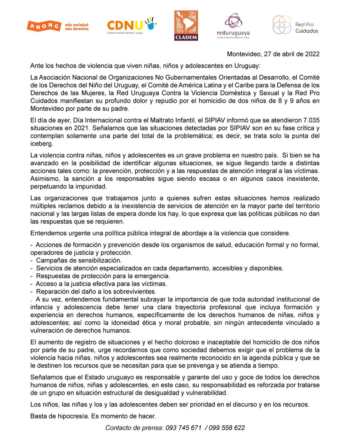 “Basta de hipocresía. Es momento de hacer”, finaliza el comunicado redactado por la Asociación Nacional de Organizaciones No Gubernamentales Orientadas al Desarrollo, el Comité de los Derechos del Niño del Uruguay, el Comité de América Latina y el Caribe para la Defensa de los Derechos de las Mujeres, la Red Uruguaya Contra la Violencia Doméstica y Sexual y la Red Pro Cuidados.