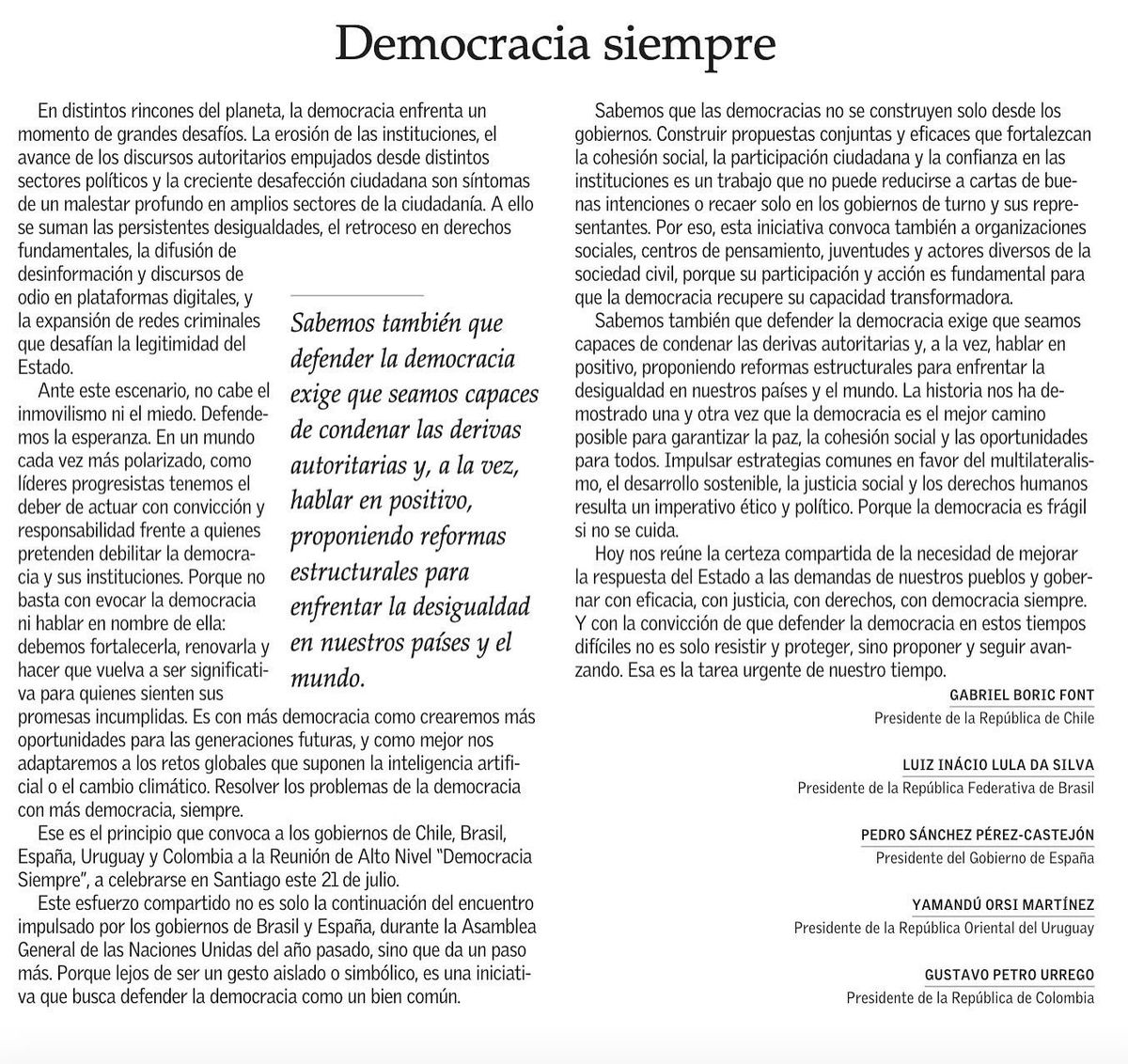 Ese es el principio que convoca a los gobiernos de Chile, Brasil, España, Uruguay y Colombia a la Reunión de Alto Nivel “Democracia Siempre”, a celebrarse en Santiago este 21 de julio.