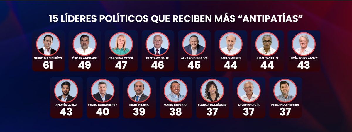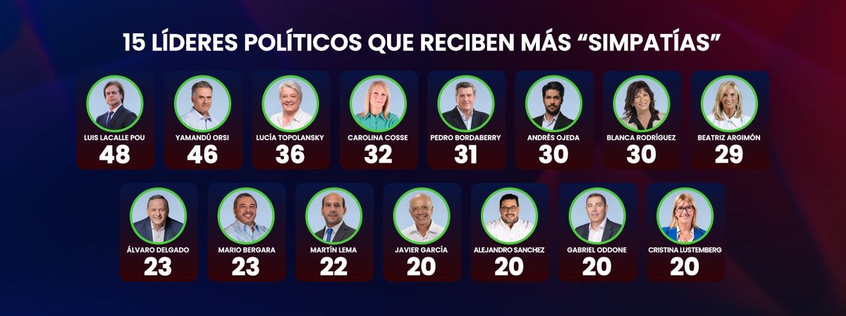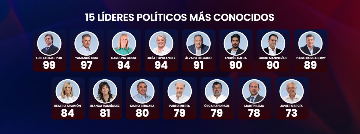 Hay varios líderes políticos que cuentan con un conocimiento muy amplio por parte de los uruguayos. Los primeros lugares los ocupan presidentes y vicepresidentes, actuales y anteriores. Luis Lacalle Pou, Yamandú Orsi, Carolina Cosse y Lucía Topolansky son los líderes más reconocidos por la población. En un segundo escalón se encuentran tres senadores y un ex senador (todos ellos con antecedentes de candidaturas presidenciales): Álvaro Delgado, Andrés Ojeda, Guido Manini Ríos y Pedro Bordaberry. Por debajo se ubica la ex vicepresidenta Beatriz Argimón, y luego otras figuras como la senadora Blanca Rodríguez, el intendente de Montevideo Mario Bergara, el excandidato a presidente por el Partido Independiente Pablo Mieres, y los senadores Óscar Andrade, Martín Lema y Javier García, que cierran el listado de los líderes políticos más conocidos del país.