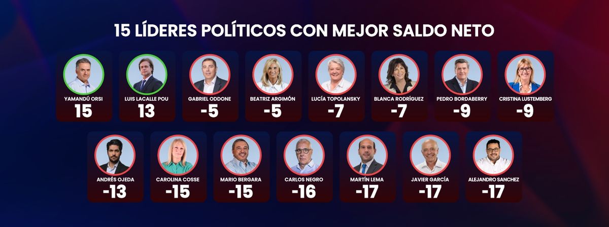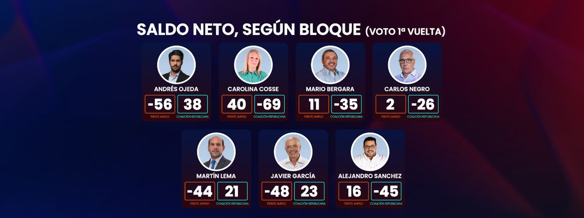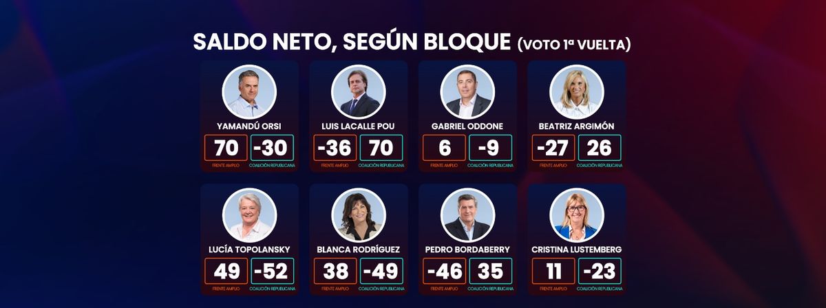 Dentro de los votantes del Frente Amplio, Yamandú Orsi tiene un saldo neto muy alto (70 puntos), y luego lo siguen Lucía Topolansky, Carolina Cosse y Blanca Rodríguez con cerca de 40. Dentro de los votantes de los partidos de la Coalición Republicana, Luis Lacalle Pou tiene un saldo muy amplio (idéntico al de Orsi entre los frenteamplistas), y luego aparecen Andrés Ojeda, Pedro Bordaberry, Beatriz Argimón, Javier García y Martín Lema. Todos ellos, cuando se miran los datos en el bloque político rival tienen, en mayor o menor medida, saldos negativos.