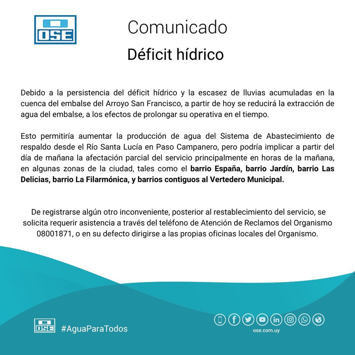 “Esto permitiría aumentar la producción de agua del Sistema de Abastecimiento de respaldo desde el río Santa Lucía en Paso Campanero, pero podría implicar a partir del día de mañana (por este jueves) la afectación parcial del servicio principalmente en horas de la mañana, en algunas zonas de la ciudad, tales como el barrio España, barrio Jardín, barrio Las Delicias, barrio La Filarmónica y barrios contiguos al Vertedero Municipal”, detalla el comunicado publicado el miércoles.