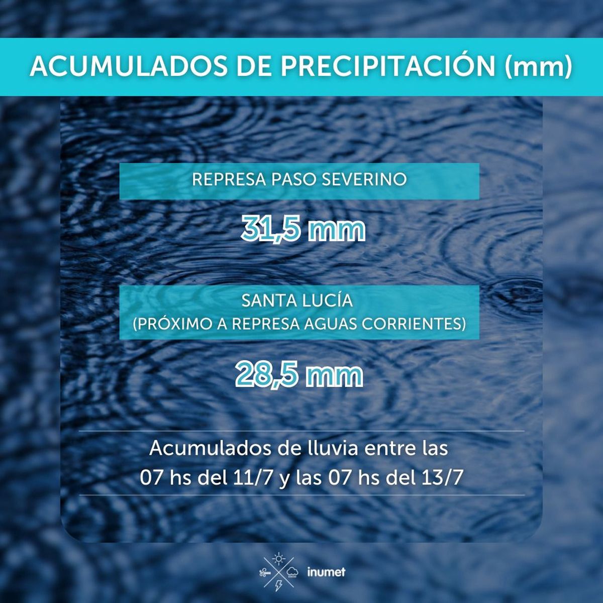 En el mismo período (48 horas) el acumulado de lluvia sobre Paso Severino es de 31,5 mm, mientras que en el Santa Lucía, cerca de la planta potabilizadora de Aguas Corrientes, el acumulado es de 25,5 mm.