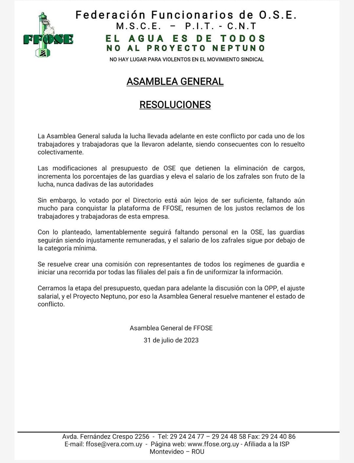 “Cerramos la etapa de presupuesto, quedan para adelante la discusión con la OPP, el ajuste salarial y el Proyecto Neptuno, por eso la Asamblea General resuelve mantener el estado de conflicto”, indica el sindicato en un comunicado.