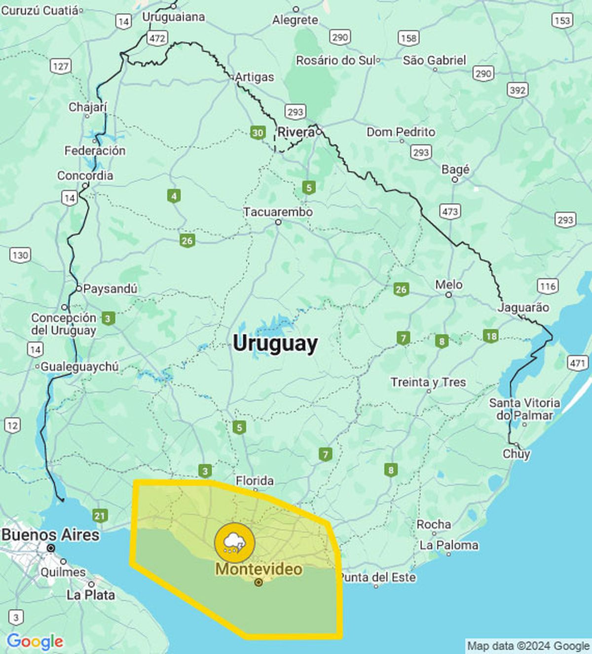 Meteorología publicó a la hora 17 una alerta amarilla por tormentas fuertes que alcanza a Montevideo y la zona sur del país, desde Colonia hasta Canelones, (ver mapa).