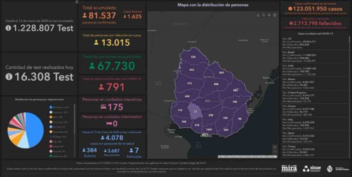 Del total de casos nuevos: 1.468 son de Montevideo, 383 de Canelones, 202 de Rivera, 102 de Salto, 97 de Rio Negro, 71 de Tacuarembó, 68 de San José, 58 de Artigas, 58 de Cerro Largo, 40 de Maldonado, 35 de Durazno, 34 de Treinta y Tres, 24 de Soriano, 17 de Colonia, 14 de Rocha, 12 de Lavalleja, 9 de Florida y 8 de Paysandú.