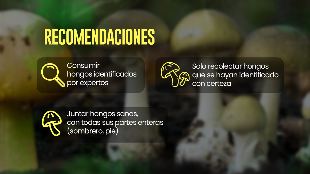 "Uno de los elementos importantes que ocurren con estas especies de amanitas es que pueden estar mezclados con otros hongos que pueden ser comestibles. Entonces por eso es que siempre recomendamos no mezclar hongos cuando se recolectan y recolectar aquellos que la persona esté absolutamente segura que son comestibles. Que estén enteros es importante porque facilita el reconocimiento", explicó.