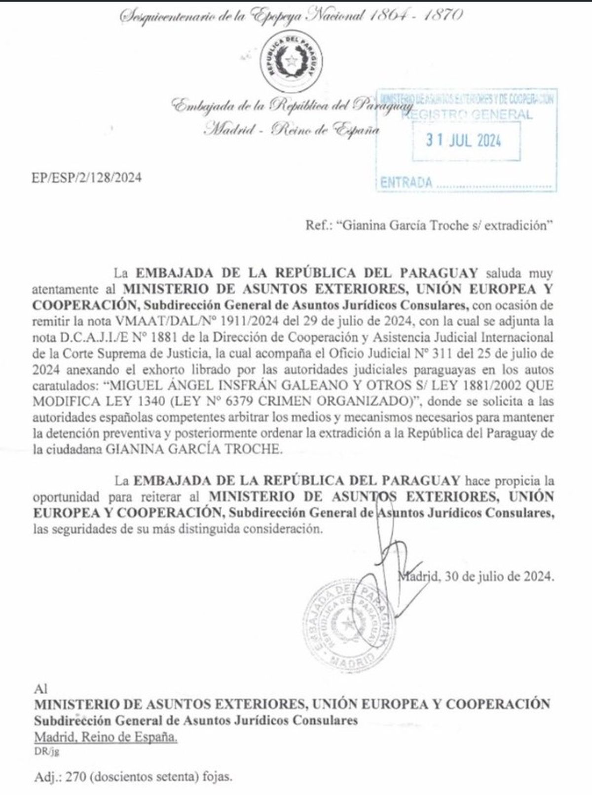 El documento remitido por la Embajada de Paraguay en Madrid al Ministerio de Asuntos Exteriores, Unión Europea y Cooperación de España solicita "arbitrar los medios y mecanismos necesarios para mantener la detención preventiva y posteriormente ordenar la extradición a la República del Paraguay de la ciudadana Gianina García Troche".
