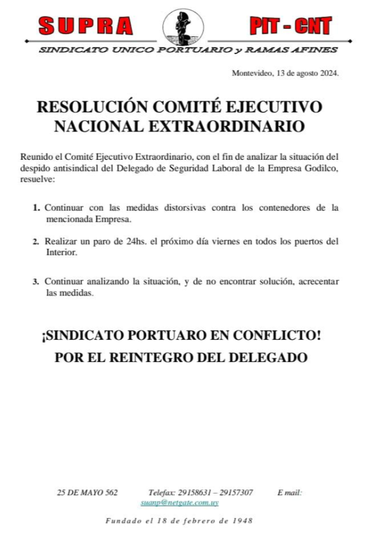 El viernes pasado, el Supra realizó otro paro general de 24 horas, pero en Montevideo. "A pesar de los intentos de solucionar la situación, la empresa continúa firme en el despido de nuestro delegado de seguridad laboral, por parte de una empresa con varios incumplimientos en la materia, ya confirmados por el Ministerio de Trabajo. Incumplimientos de tal magnitud que llegaron a la internación por asfixia de un trabajador, y sanciones por parte del MTSS", afirmaba el Supra en el comunicado de ese momento.