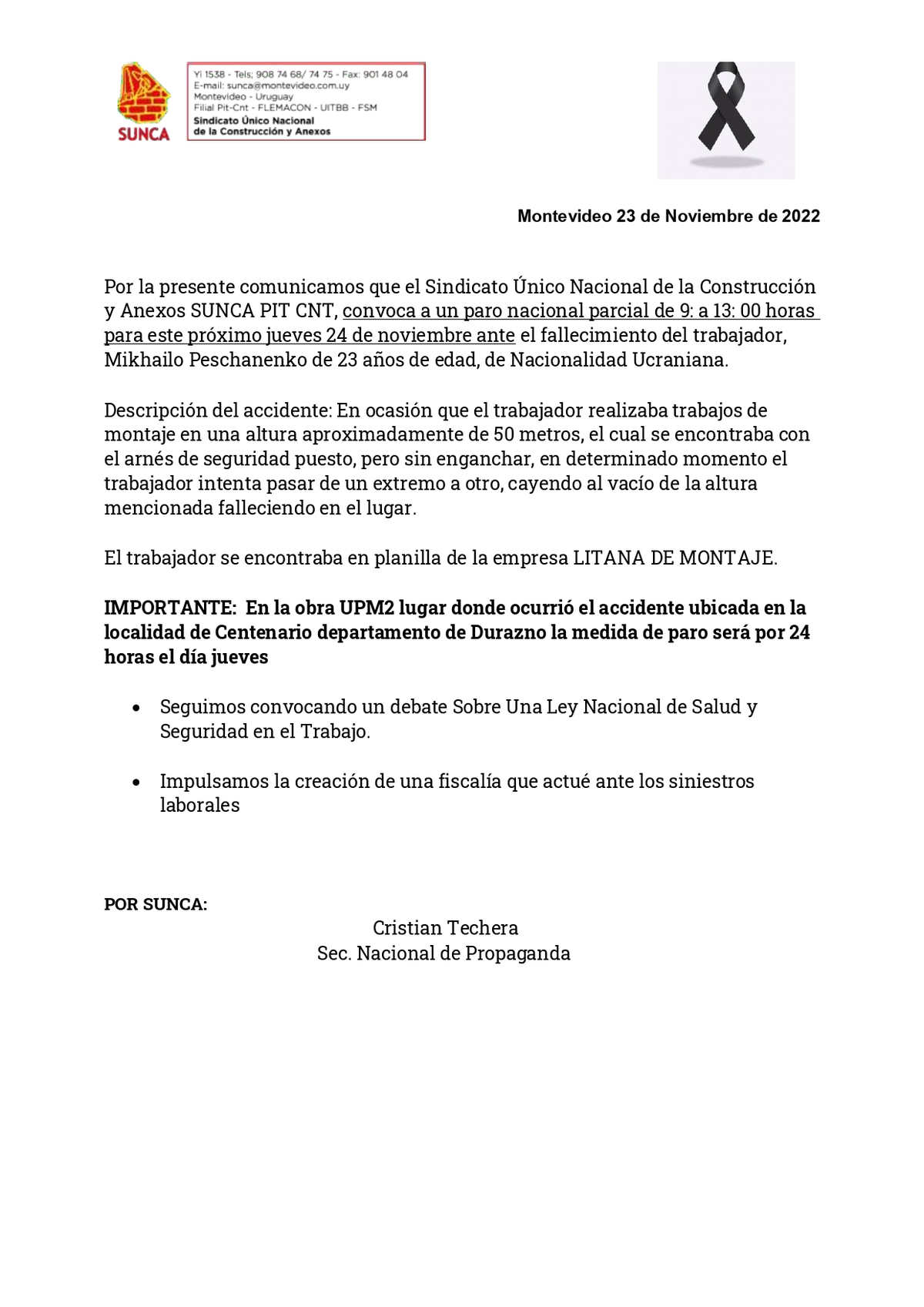 El Sunca convocó para un paro parcial este jueves de 9:00 a 13:00, como respuesta a la muerte del joven ucraniano que cayó desde una chimenea en la planta UPM 2, en Durazno. El paro en la empresa en cuestión se extiende por 24 horas.