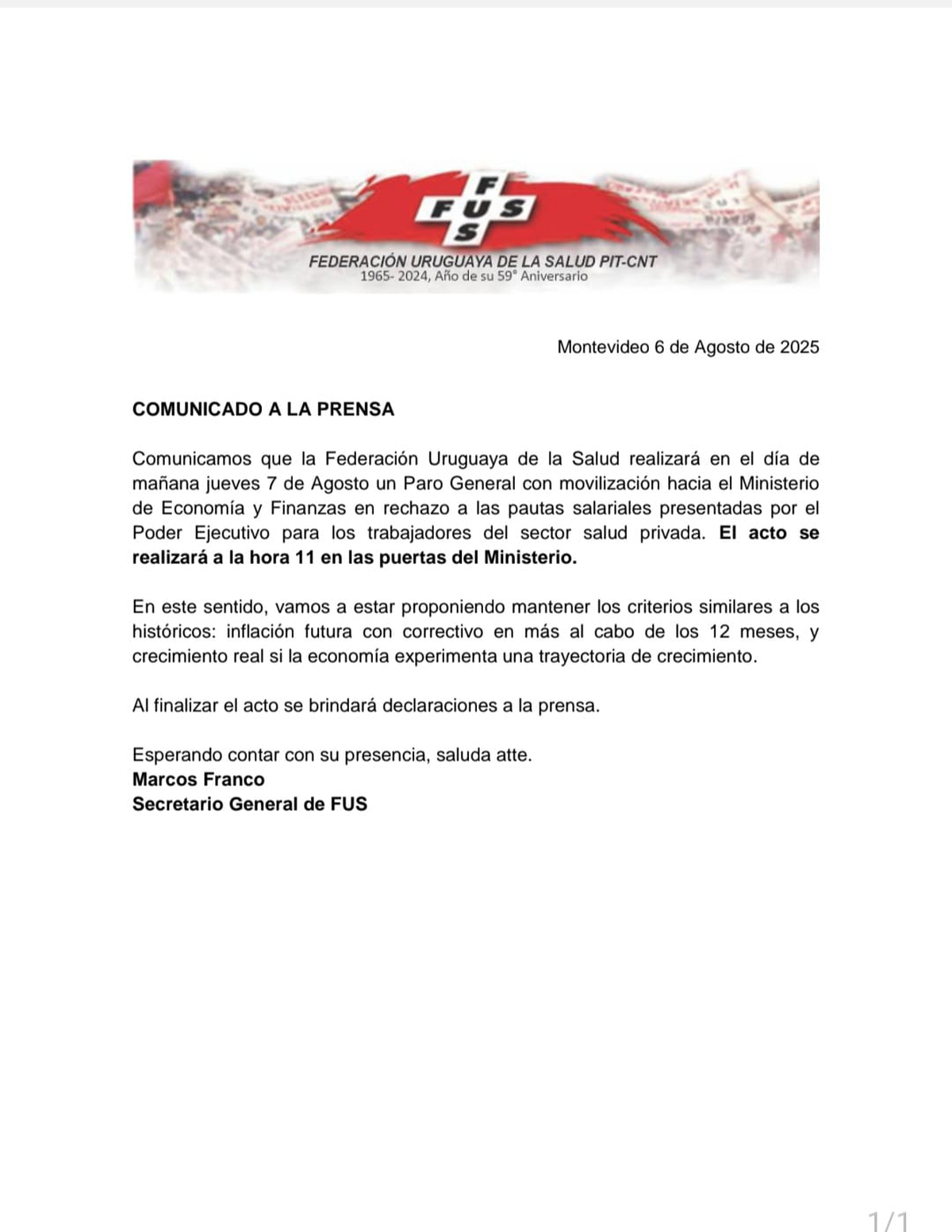 La Federación Uruguaya de la Salud (FUS) realizará un paro en las mutualistas este jueves, en rechazo a las pautas salariales marcadas por el gobierno.