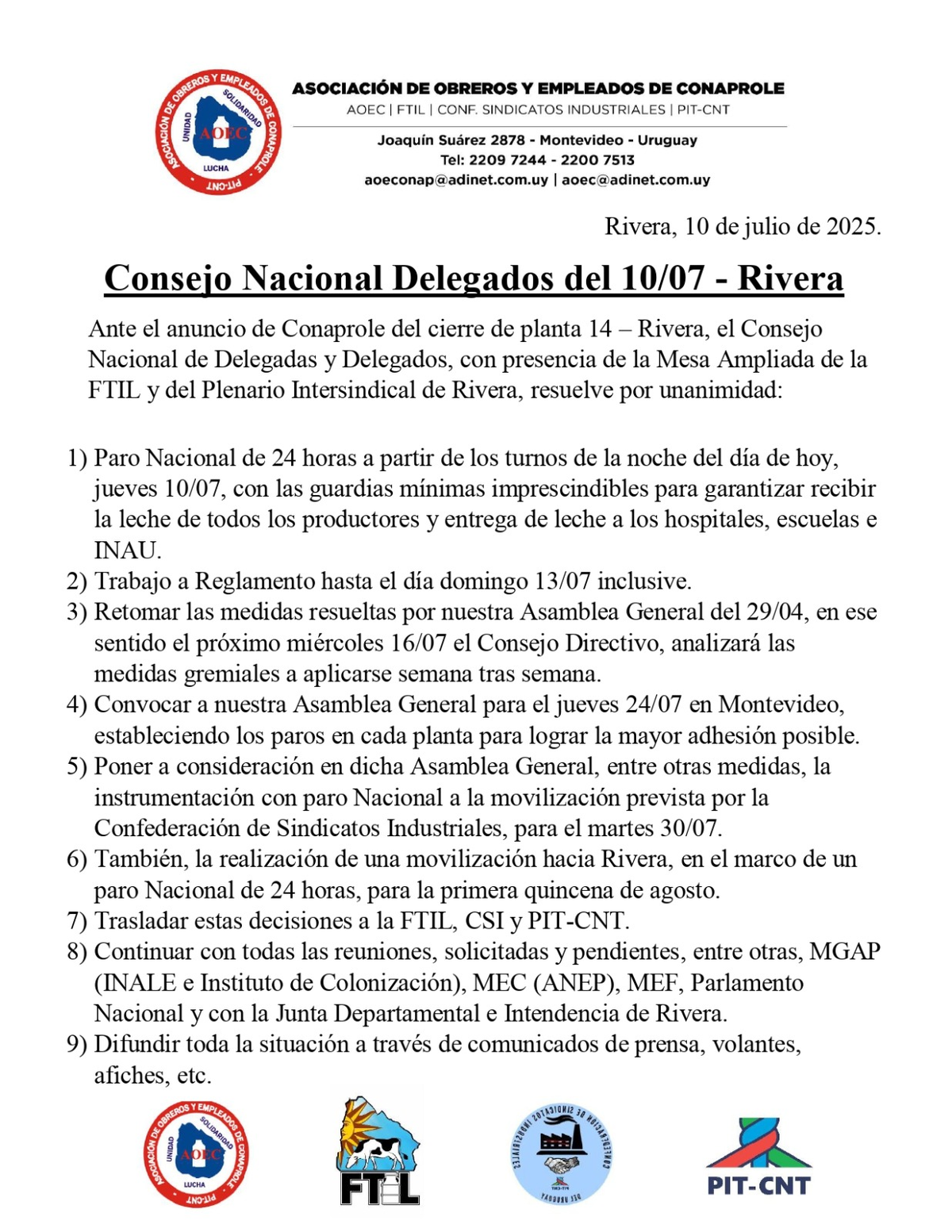 Además, trabajarán a reglamento hasta el domingo y análisis de las medidas cada semana. Habrá asamblea general el jueves 24 de julio, cuando establecerán paros en plantas.