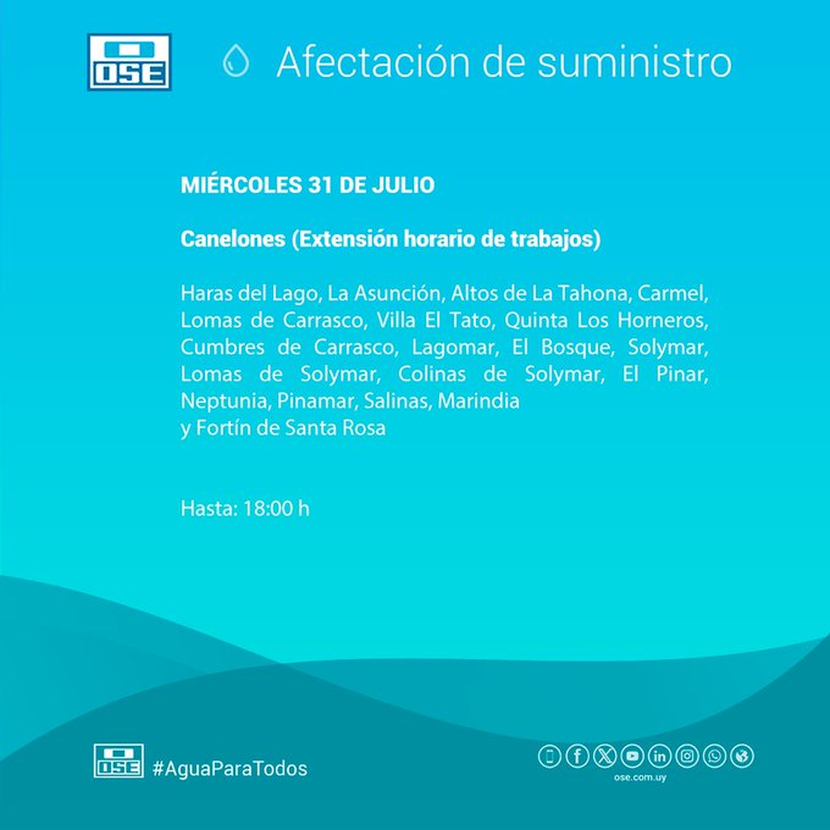La zona afectada, según OSE, es Haras del Lago, La Asunción, Altos de La Tahona, Carmel, Lomas de Carrasco, Villa El Tato, Quinta de los Horneros, Cumbres de Carrasco, Lagomar, El Bosque, Solymar, Lomas de Solymar, Colinas de Solymar, El Pinar, Neptunia, Pinamar, Salinas, Marindia y Fortín de Santa Rosa.