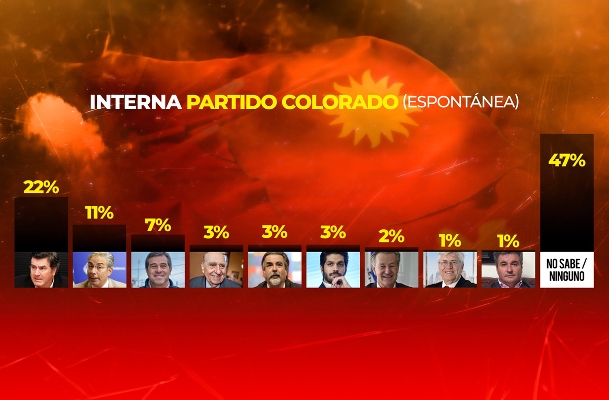 En la pregunta espontánea, casi la mitad de los colorados (47%) no sabe a qué candidato votaría, y si se suman las menciones a candidatos que no competirán como Ernesto Talvi (7%) o Julio María Sanguinetti (3%), la proporción de no definidos alcanza a casi seis de cada diez. El nombre más mencionado en forma espontánea es el de Pedro Bordaberry (22%), quien no ha dado ningún indicio de tener intenciones de competir (aunque tampoco lo ha descartado explícitamente). Entre los candidatos que sí están en competencia, el único que supera el 10% es Robert Silva, y luego aparecen por debajo del 5% Gustavo Zubía, Andrés Ojeda, Gabriel Gurméndez, Tabaré Viera y Guzmán Acosta y Lara.