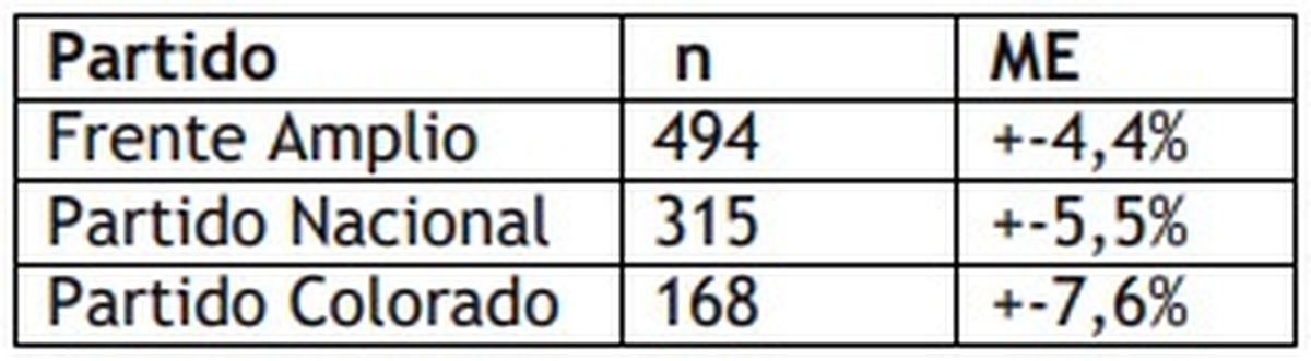El universo de estudio de los datos presentados son todas las personas que se sienten “cercanas” o “muy cercanas” a cada partido político, mayores de 18 años y residentes en todo el territorio nacional. El número de personas encuestadas con esta característica para cada partido político y su respectivo margen de error máximo esperado dentro de un intervalo de confianza del 95% se observan en la siguiente tabla: