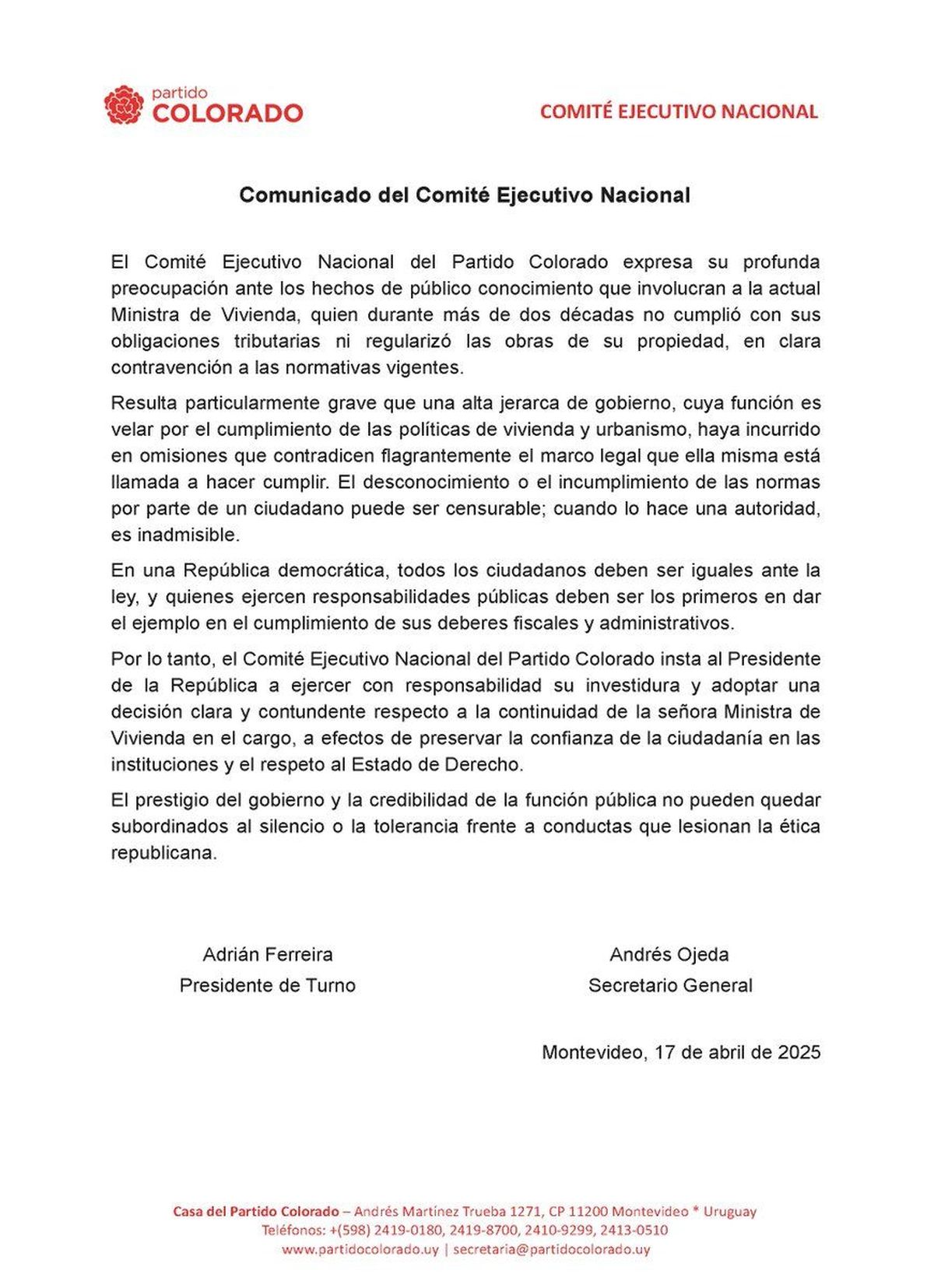 El Partido Colorado insta al presidente Yamandú Orsi "a ejercer con responsabilidad su investidura y adoptar una decisión clara y contundente respecto a la continuidad de la señora Ministra de Vivienda en el cargo, a efectos de preservar la confianza de la ciudadanía en las instituciones y el respeto al Estado de Derecho".