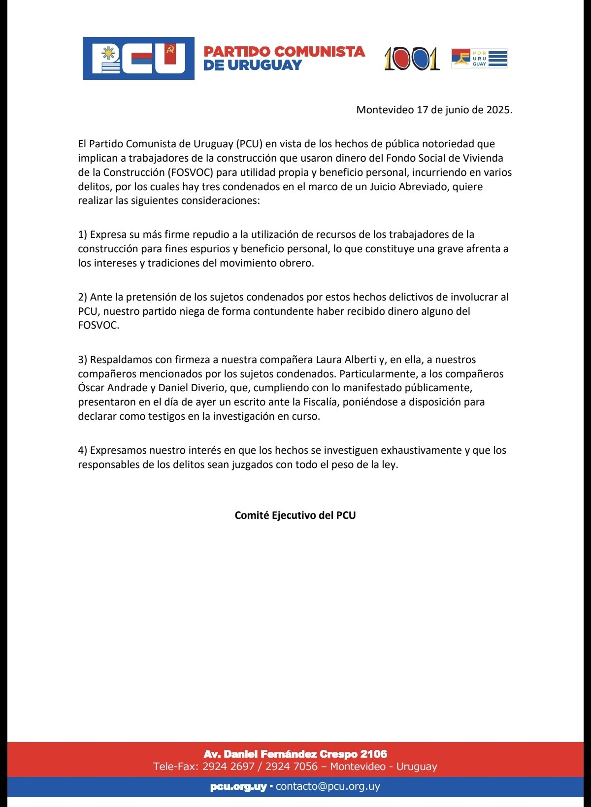 El PCU expresó su "más firme repudio a la utilización de recursos de los trabajadores de la construcción para fines espurios y beneficio personal", expresó en un comunicado. Recordó que "constituye una grave afrenta a los intereses y tradiciones del movimiento obrero".