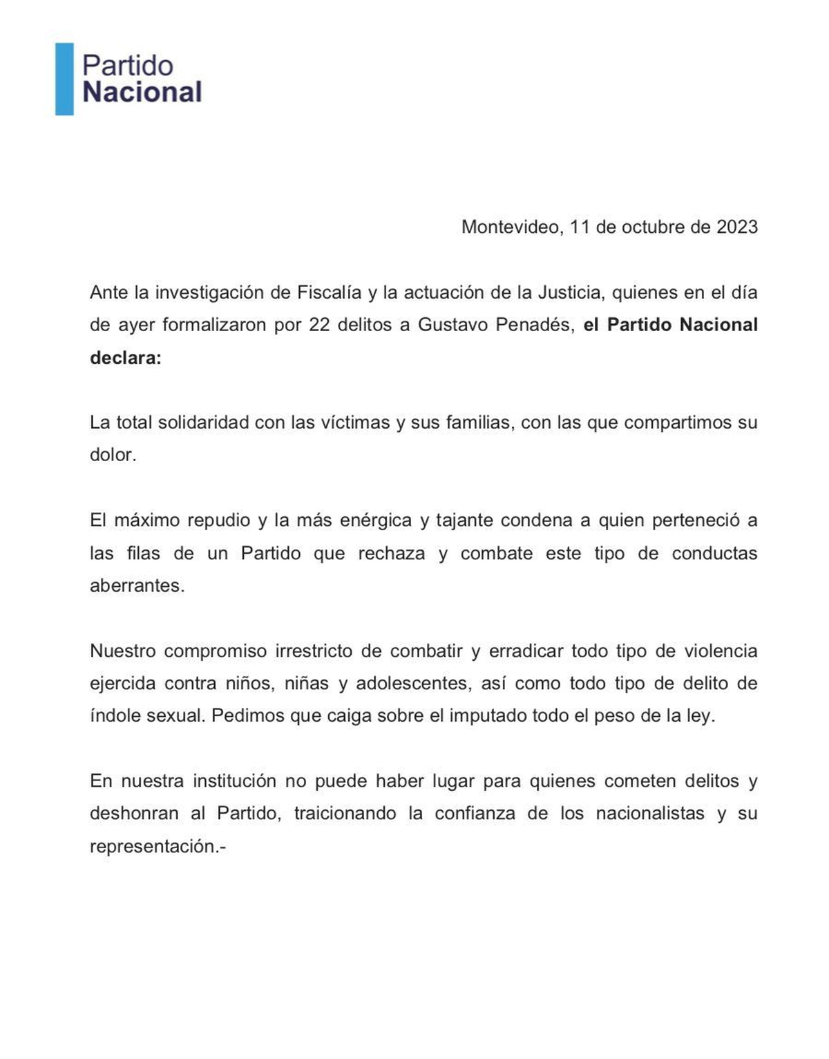 El Partido Nacional expresó su "máximo repudio" a los delitos cometidos por el senador Gustavo Penadés. Además se solidarizó con las víctimas y sus familias.