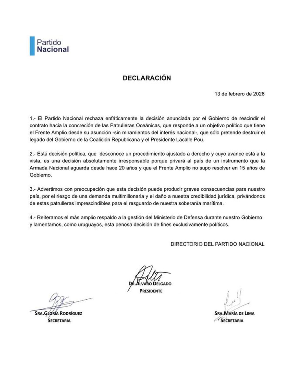 El Directorio del Partido Nacional emitió una declaración en la que "rechaza enfáticamente" la decisión anunciada por el Gobierno de rescindir el contrato con el astillero Cardama para la construcción de dos patrullas oceánicas para la Armada Nacional.