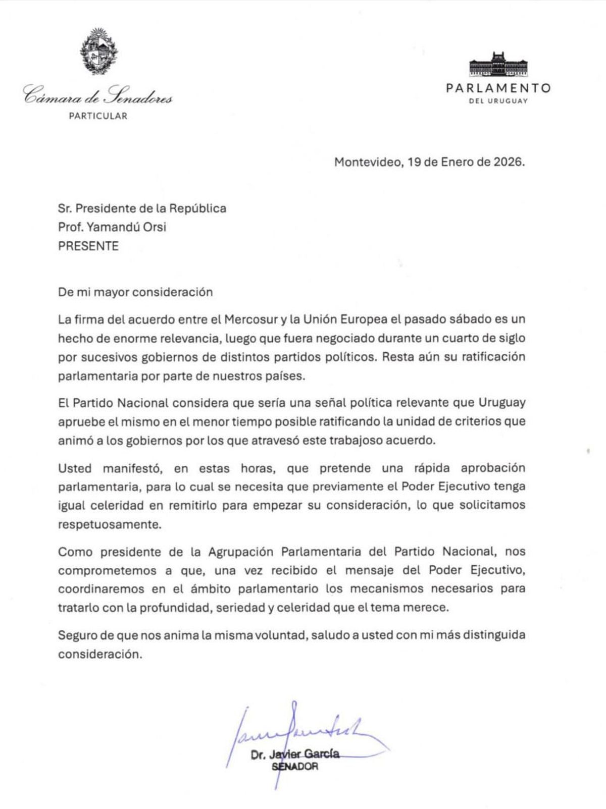 El senador Javier García, en su calidad de presidente de la agrupación parlamentaria del Partido Nacional, envió una nota este lunes 19 al presidente Orsi en la que solicita el envío “en el menor tiempo posible” del proyecto de ley para ratificar este acuerdo, calificado como histórico y apoyado por todos los partidos políticos.