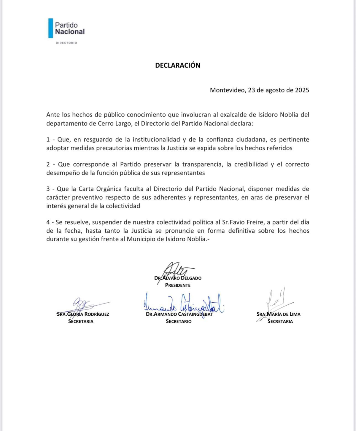"Se resuelve suspender de nuestra colectividad política al Sr. Favio Freire, a partir del día de la fecha, hasta tanto la Justicia se pronuncie en forma definitiva sobre los hechos durante su gestión frente al Municipio de Isidoro Noblía", señala el comunicado del Partido Nacional.