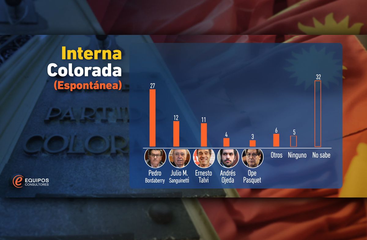 Pedro Bordaberry lidera con amplitud las preferencias de los colorados para la candidatura presidencial de 2024, tanto en respuesta espontánea, como en la que resulta de dar al encuestado una lista de nombres, según la última medición de opinión pública, a nivel nacional de Equipos Consultores.