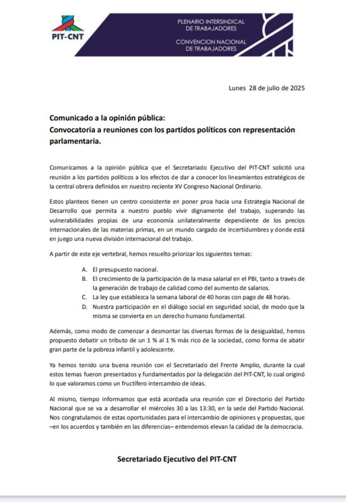 Este lunes, el Secretariado Ejecutivo del PIT-CNT emitió una declaración en la que da cuenta de la solicitud de una reunión a los partidos políticos para dar a conocer sus lineamientos estratégicos para avanzar hacia una estrategia nacional de desarrollo, con énfasis en el presupuesto nacional, crecimiento de la masa salarial en el PIB a través de la creación de empleos de calidad y aumentos de salarios, reducción de la semana laboral de 48 a 40 horas, y participación en el diálogo social en seguridad social.