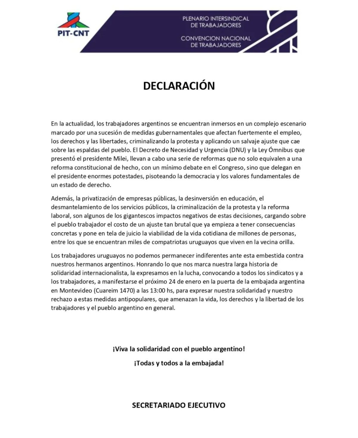 El PIT-CNT convoca para el próximo miércoles 24 de enero a una movilización en solidaridad con el pueblo argentino. El evento tendrá lugar en la Embajada Argentina ubicada en Cuareim 1470 a la hora 13.