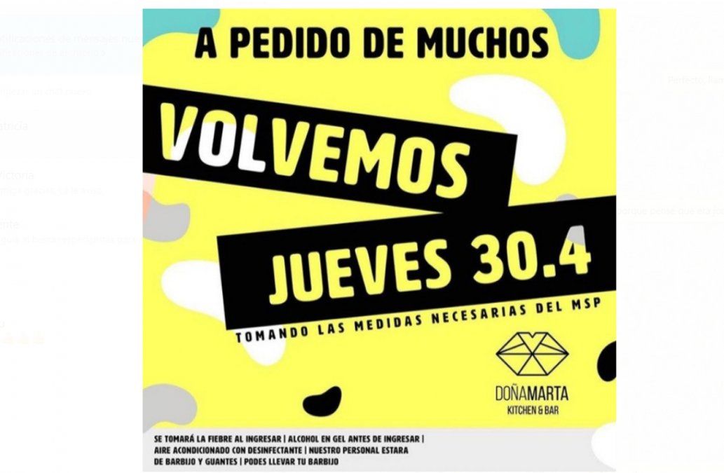 La publicación de un flyer del boliche “Doña Marta” en redes sociales levantó polémica. En el mismo se anuncia que abrirán “tomando las medidas necesarias del MSP”. También detalla que se tomará la fiebre al ingresar, que habrá alcohol en gel, que el personal estará de barbijo y guantes, instan a llevar “tu propio barbijo” y anuncian que tendrán “aire acondicionado con desinfectante”.