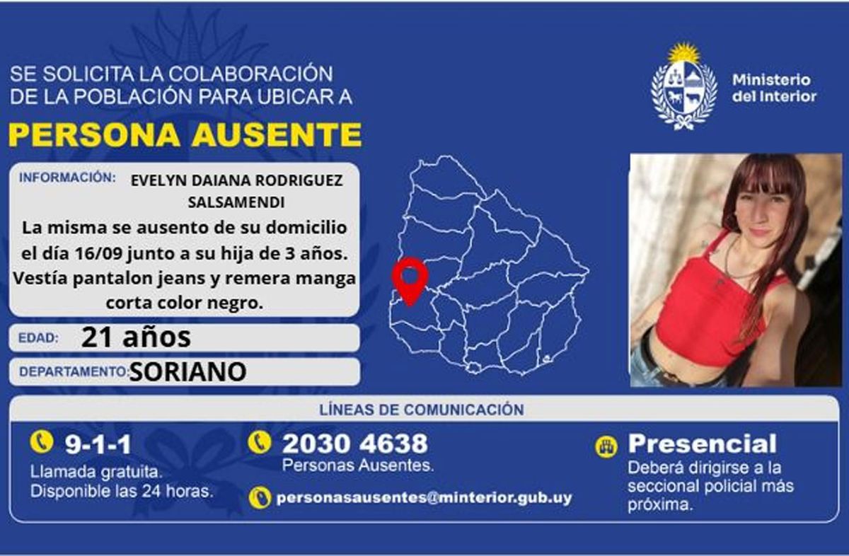 De acuerdo a un comunicado de la Policía de Soriano, la denuncia la presentó la madre de Evelyn, abuela de la niña. Dijo a los policías que "la joven dejó una carta indicando que se iba".