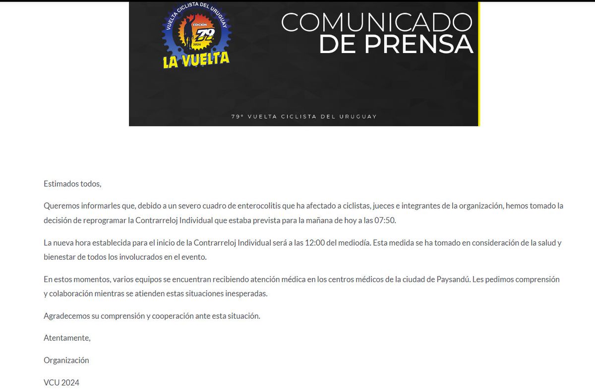 De acuerdo a un comunicado interno de los organizadores hacia los equipos que compiten en la Vuela Ciclista 2024, y al que accedió Subrayado, la contrarreloj se fijó para el mediodía de este miércoles “en consideración de la salud y bienestar de todos los involucrados en el evento”.