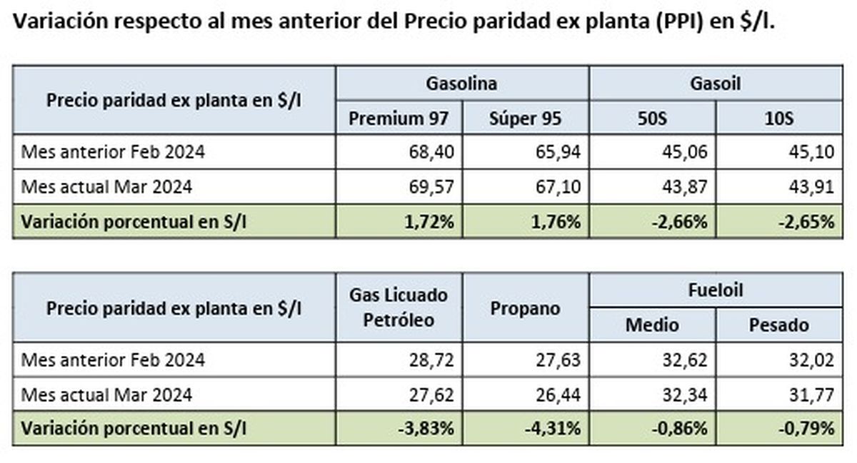 En el caso del gasoil, el 50S da una reducción de 2,66% y el 10S de 2,65% en la variación entre los meses de febrero y marzo. El supergás también da un ajuste a la baja de 3,83%.
