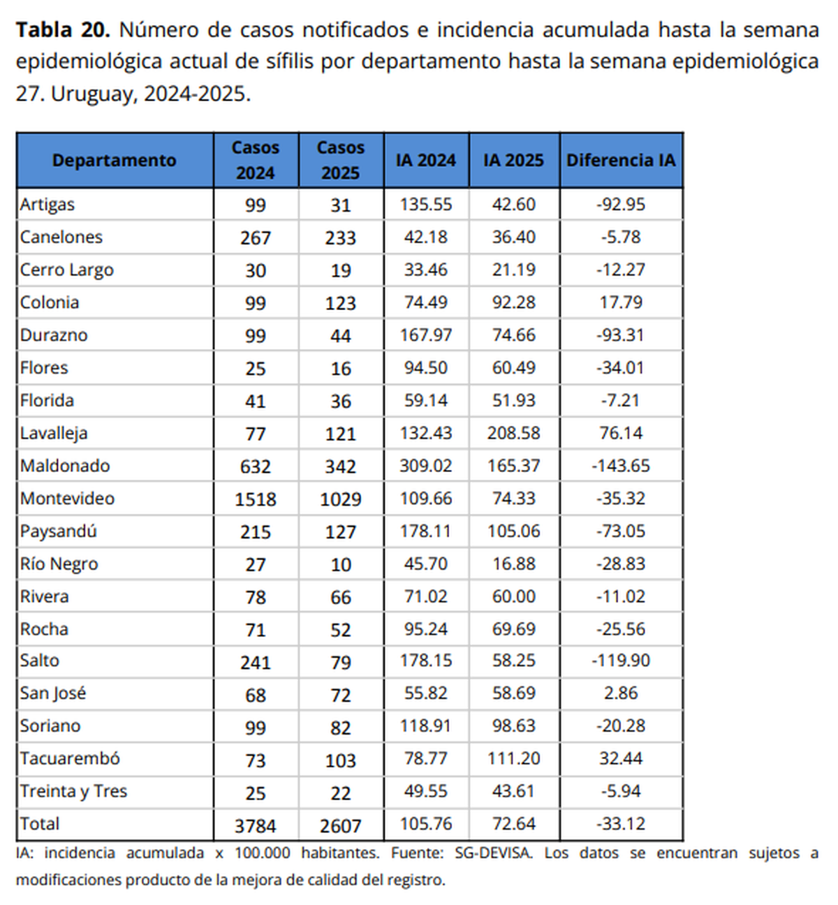 Hay preocupación por el aumento de casos de sífilis en el país. De acuerdo a datos del Ministerio de Salud Pública (MSP), en 27 semanas del 2024 los casos fueron 3.784 y 2.607 en 27 semanas de 2025.