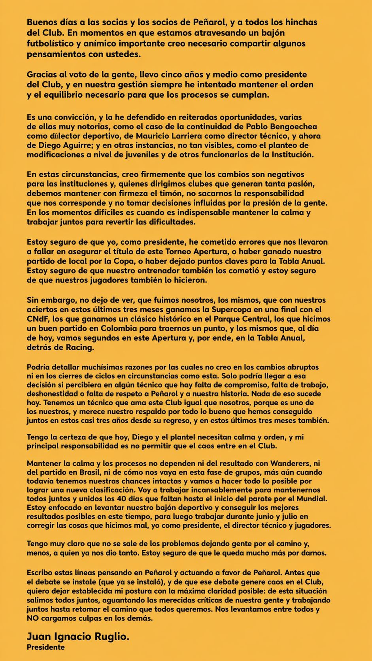 El presidente de Peñarol, Ignacio Ruglio, publicó un mensaje dirigido a socios e hinchas de Peñarol en el que pidió “mantener la calma” y respaldó al entrenador Diego Aguirre en un momento de “bajón futbolístico y anímico importante”.