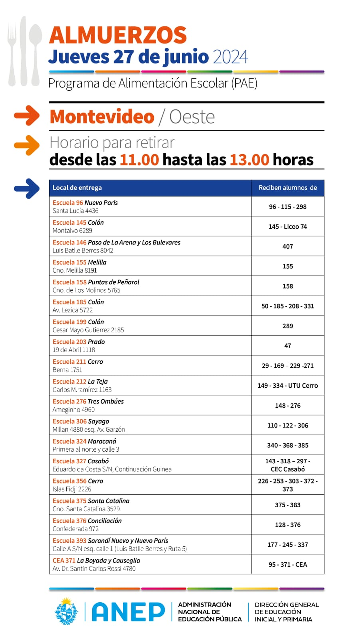 “El Programa de Alimentación Escolar (PAE) de la DGEIP ofrecerá el servicio de comedor habitual en las escuelas abiertas, con docentes presentes. En el caso de escuelas abiertas sin presencia de docentes, se entregarán viandas en las sedes detalladas en el listado que se adjunta. Dicha entrega se realizará desde las 11 hasta las 13 horas. Para el resto del país se organizará el Servicio de Alimentación en cada Inspección Departamental”, dice el comunicado de Primaria, y adjunta la lista de escuelas que brindarán la alimentación a los niños.