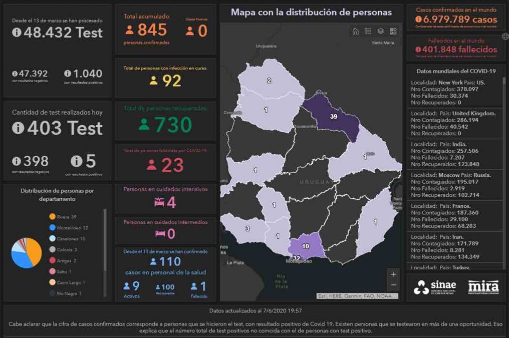 Uruguay no registró ningún caso nuevo de coronavirus COVID-19 por lo tanto la cantidad de casos positivos acumulados sigue siendo 845. Del total de estos casos, 730 se recuperaron y 23 fallecieron.
